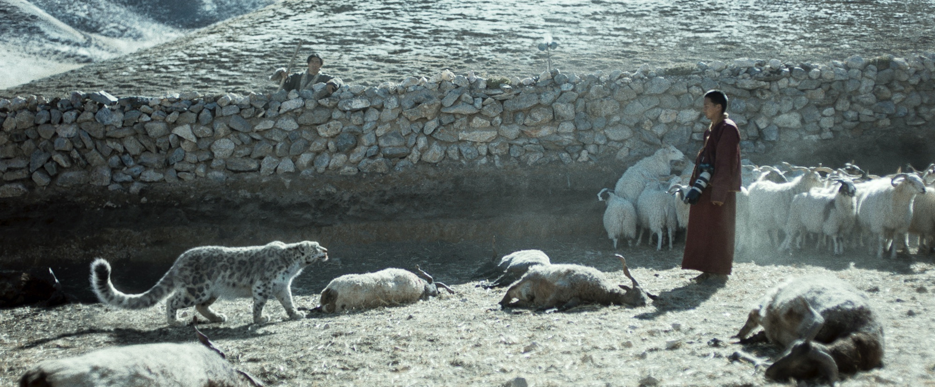On connaît en Europe le débat qui oppose les écologistes et une partie des bergers ou des agriculteurs, quand il s’agit de réimplanter le loup dans nos forêts. À sa manière, Le léopard des neiges pose les mêmes questions, mettant en antagonisme un berger plutôt pauvre, attaché à ses bêtes et au revenu de sa famille, des policiers soucieux d’appliquer la réglementation en matière de défense des léopards des neiges, et une équipe de télévision qui se nourrit de la discorde. Au milieu de ce petit monde, il y a cet animal énigmatique, superbe, qui a franchi un enclos et tué des brebis, laissant dans son petit dans l’isolement le plus total à quelques centaines de mètres et un moine qui cherche à atteindre une certaine sagesse.
