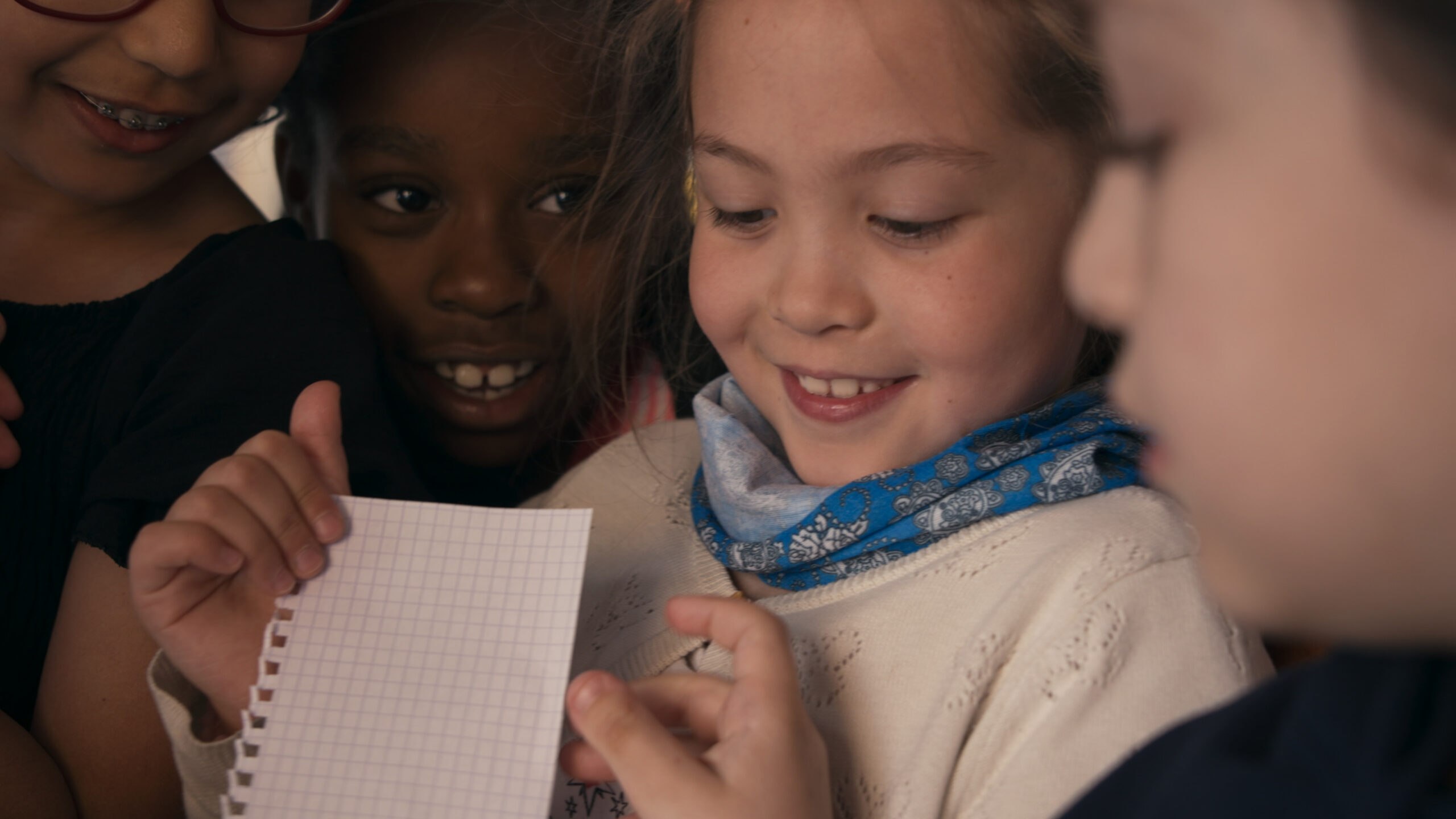 Avec sa caméra légère, « comme un appareil photo », la réalisatrice saisit tous ces petits moments, cette vie qui se déroule dans un huis clos où les enfants et les adultes partagent la même mission : apprendre. Apprentissages scolaires, mais aussi apprentissages d’une vie en commun, de partage, de respect, de réflexion sur le monde qui les entoure.